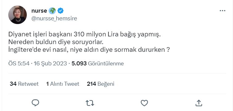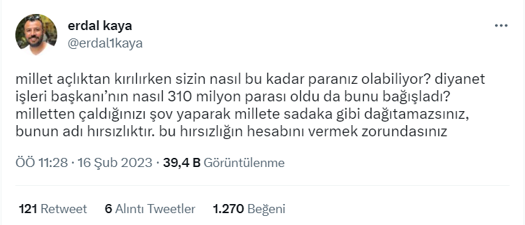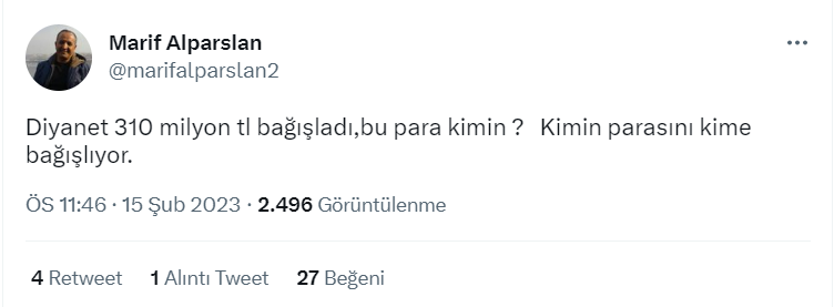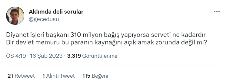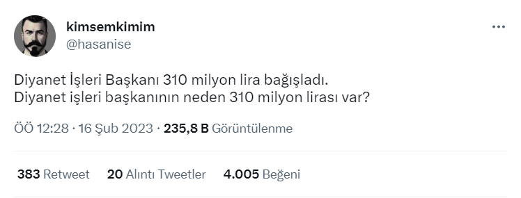 Diyanet İşleri Başkanı’nın deprem bölgesine şahsi olarak 310 milyon lira bağışladığı iddiası