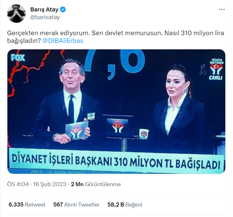 Araştırmamız sonucunda canlı yayına bağlanan Ali Erbaş’ın bağış açıklaması esnasında ekrana yansıyan altyazının yanlış anlaşıldığı sonucuna varıyoruz. Oysa Ali Erbaş deprem bölgesi için şahsi olarak 310 milyon lira değil 3 maaşını bağışladı.