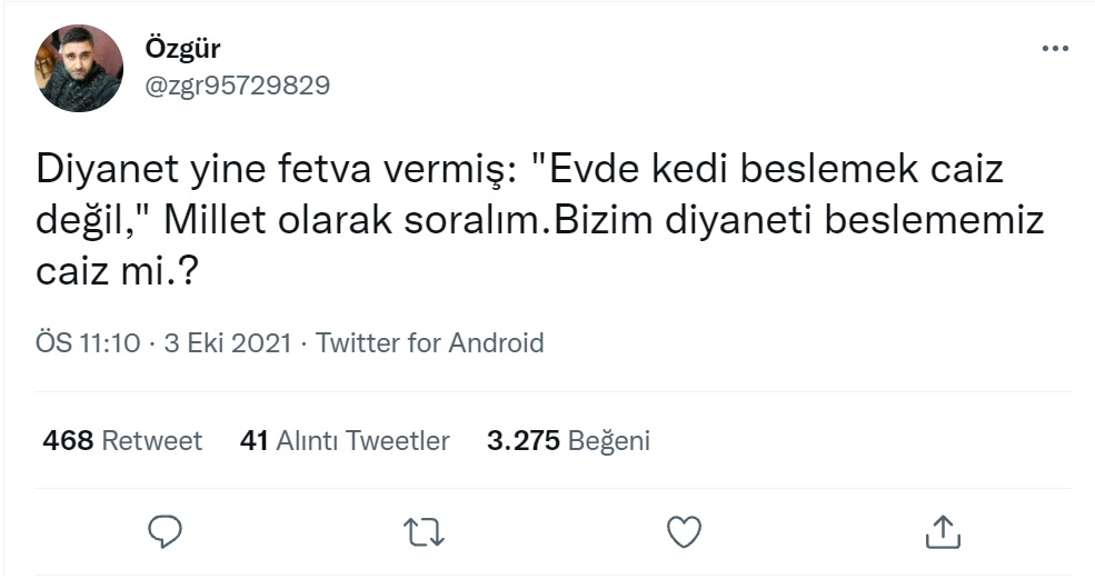 - Diyanet İşleri Başkanlığı’nın ‘evde kedi beslemek caiz değil’ şeklinde bir fetvası bulunmuyor.