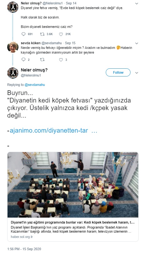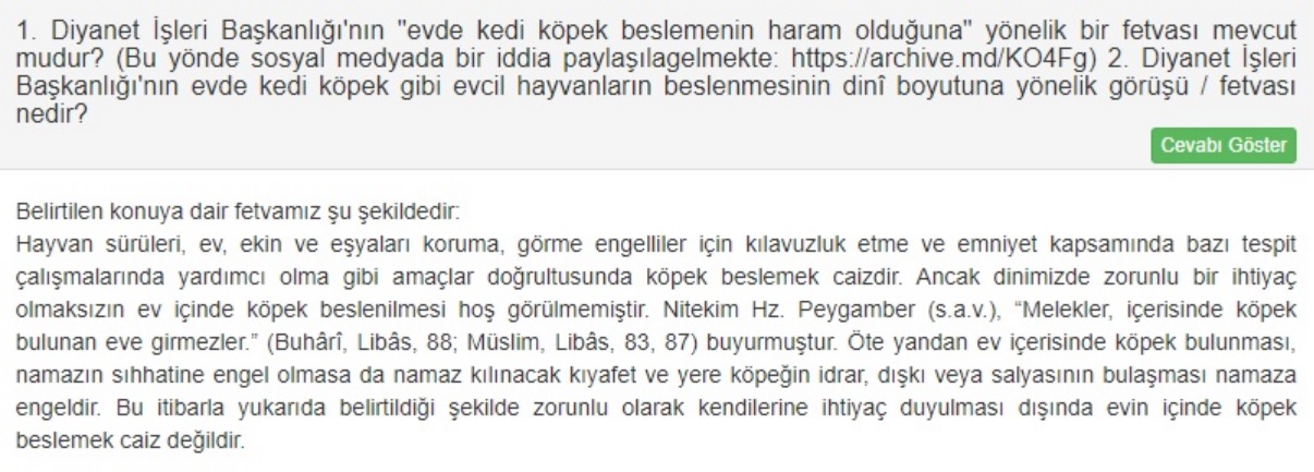 2017’de aynı haberi Halk Web de yayımlamıştır. Paylaşımı yapan kullanıcı tarafından kaynak gösterilen Sol Haber de Ajanimo.com da haber metninde Diyanet’in bu konuda bir fetva verdiğine dair bir bilgi vermemiştir. İlgili haber Diyanet İşleri Başkanlığı yaz programının konu başlıklarından bahsedilmiştir. Haberde Şafii mezhebinin kedi ve köpek beslemeye dair görüşünü içermektedir. Din İşleri Yüksek Kurulu’nun fetvalar yayını incelendiğinde evde kedi beslemenin caiz olmadığına yönelik bir fetva olmadığı görülmektedir.