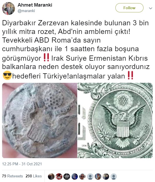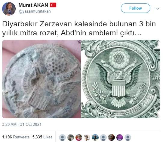 Twitter’da bir süredir gündemde olan bir paylaşımda Zerzevan Kalesi’nde sürdürülen kazı çalışmasında 3000 yıllık bir rozet bulunduğu iddia edilmektedir. Bu rozetin ABD’nin kuruluşunda basılan amblem olduğunu belirten Twitter kullanıcılarının Tweetlerini inceledik ve tarihsel olarak tutarsızlık içeren bu iddiayı araştırdık.