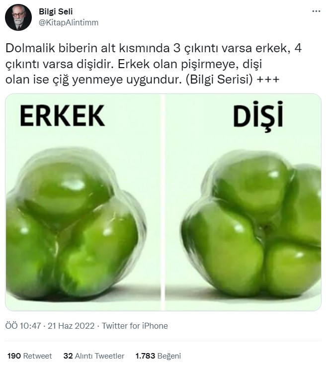 İddiaya göre; yemeklerimizde kullandığımız dolmalık biberin bir cinsiyeti var ve bu ayrım, biberin altındaki çıkıntıların sayısına göre anlaşılıyor. Eğer üç çıkıntı varsa biber erkek, dört çıkıntı varsa dişi sayılıyor. Erkek biberler pişirmeye, dişi olanlar çiğ yenilmeye uygun.