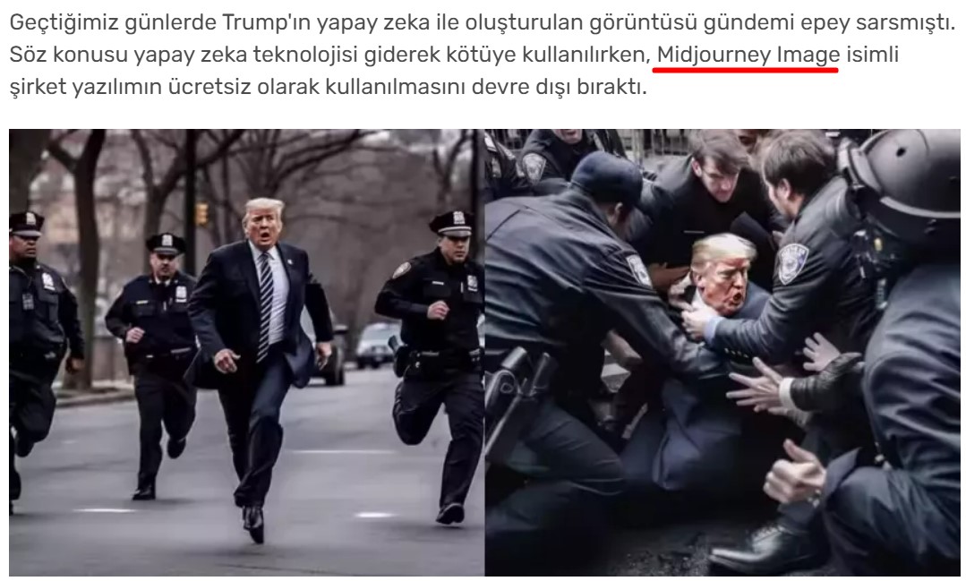 Haber sitelerinde işbu görüntülerin Midjourney isimli bir yapay zeka tabanlı görselleştirme botu ile oluşturulduğuna dair hakim bir görüş var. Bu sefer araştırmamızı bu yönde ilerletiyor ve “Donald Trump”, “Midjourney AI” gibi bazı anahtar kelimelerle konuyu arıyoruz.