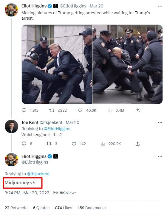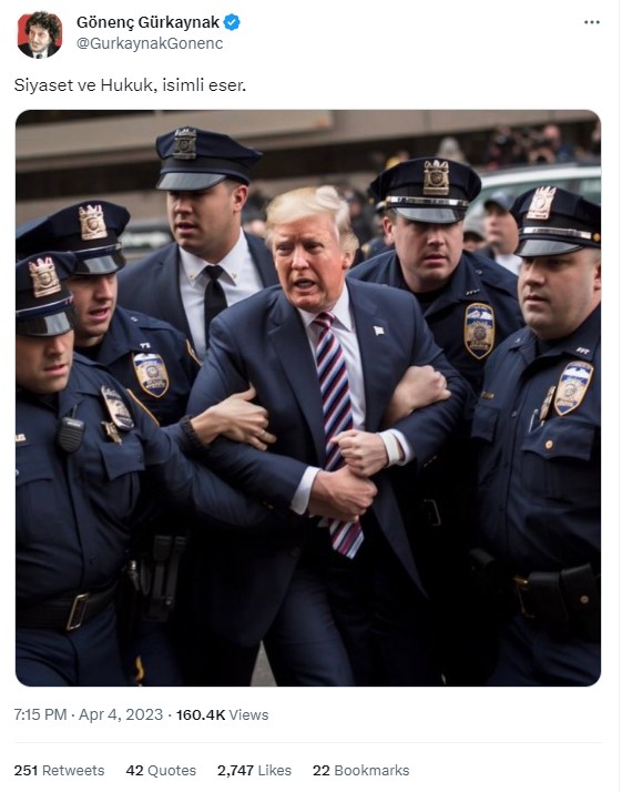 Daha sonra görselin yapay zeka ile oluşturulduğuna dair bazı bulgulara erişiyoruz. Yapay zeka tabanlı bir bot üretimi bu görüntüleri ilk kez Twitter’da gazeteci Eliot Higgins paylaşmış. Higgins, 20 Mart’ta paylaştığı görüntülerde, Donald Trump’ın olası tutuklanma durumunda nasıl bir görüntü oluşacağına dair bir görsel dizisi hazırlayarak şu notu eklemiş: “Trump’ın tutuklanmasını beklerken Trump’ın tutuklandığının resimlerini yapmak”