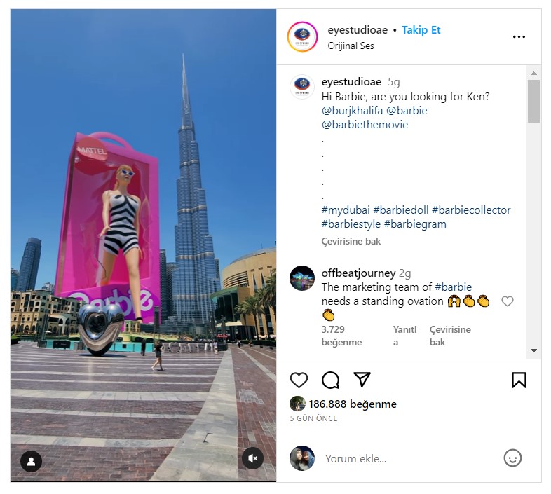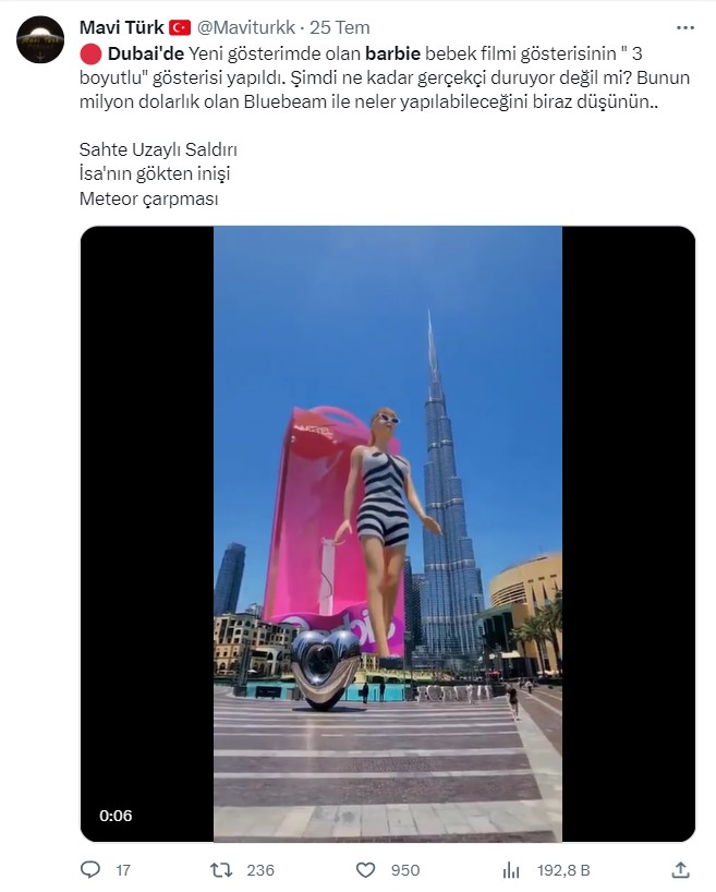 Dubai’de Barbie filminin 3 boyutlu reklamı olarak medyada yayılan bu görüntünün aslında bir ajans tarafından CGI (bilgisayar tabanlı görsel) ile üretildiğini ancak gerçekte böyle bir reklamın var olmadığını görüyoruz.