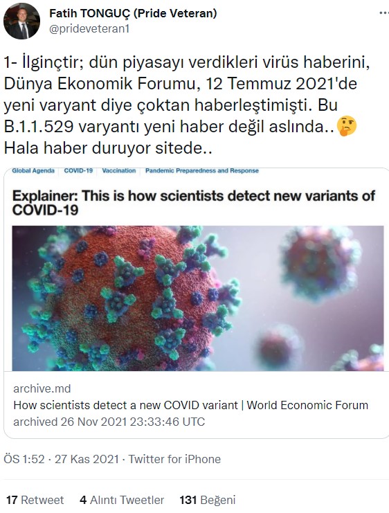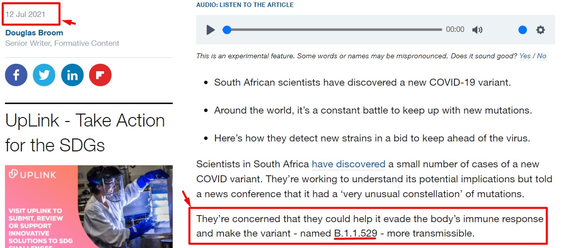 Dünya Ekonomik Forumu’nun (WEF) koronavirüs ile alakalı 12 Temmuz’da yayınladığı makalenin arşivlenmiş halinde “Omicron varyantı” ile ilgili bir ifade bulunmamaktadır. Dünya Sağlık Örgütü’nün 24 Kasım’da yeni varyantı bildirdikten sonra WEF yazısını güncellemiştir.