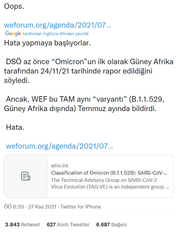 İddiaya göre 26 Kasım 2021’de Dünya Sağlık Örgütü’nün (WHO) Omicron varyantını resmen bildirmesinden aylar önce Dünya Ekonomik Forumu (WEF) bu konu ile alakalı bir makale paylaşmıştı. Söz konusu söylenti, aşı karşıtı ve komplo teorisyeni hesaplar tarafından çok geçemeden yayıldı