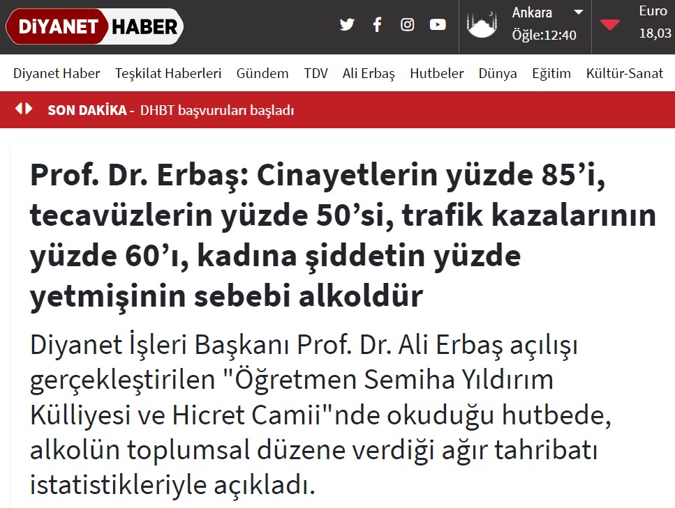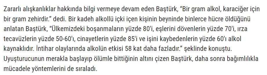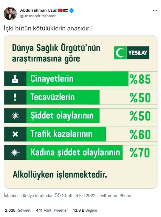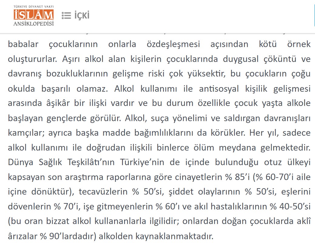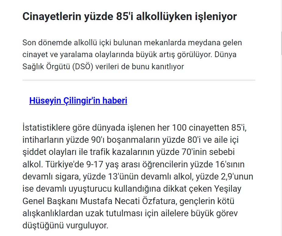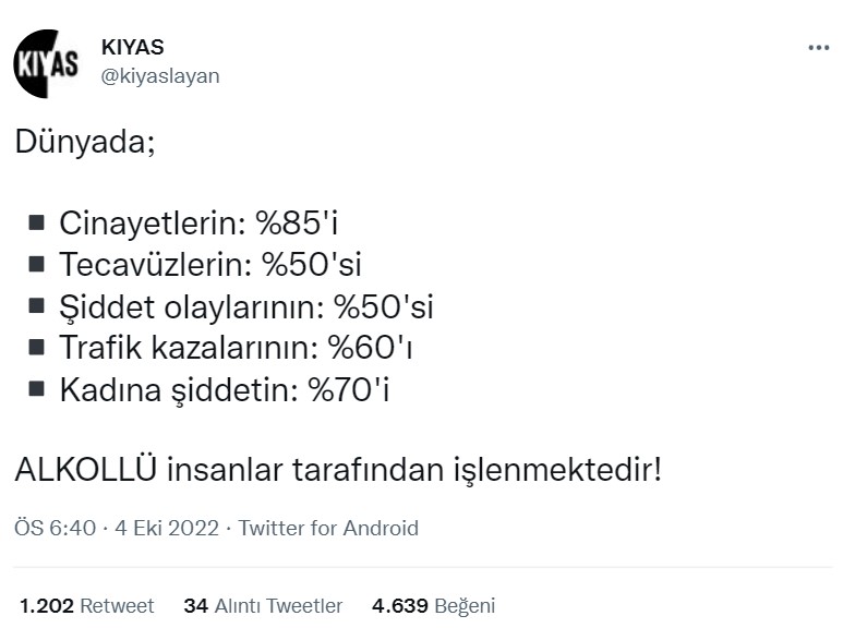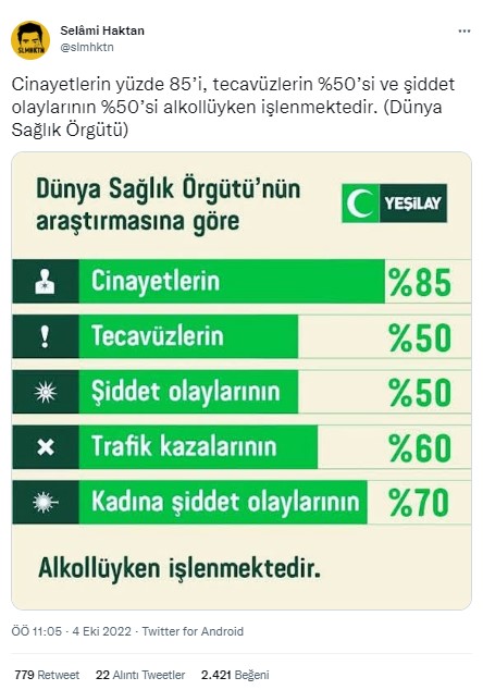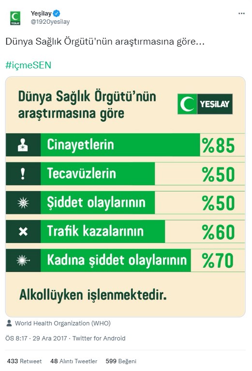Sosyal medyada dolaşıma giren bir paylaşıma göre Dünya Sağlık Örgütü’nün araştırması; cinayetlerin %85’inin, tecavüzlerin %50’sinin, şiddet oranlarının %50’sinin, trafik kazalarının %60’ının ve kadına şiddetin %70’inin alkollü insanlar tarafından işlendiğini gösteriyor.