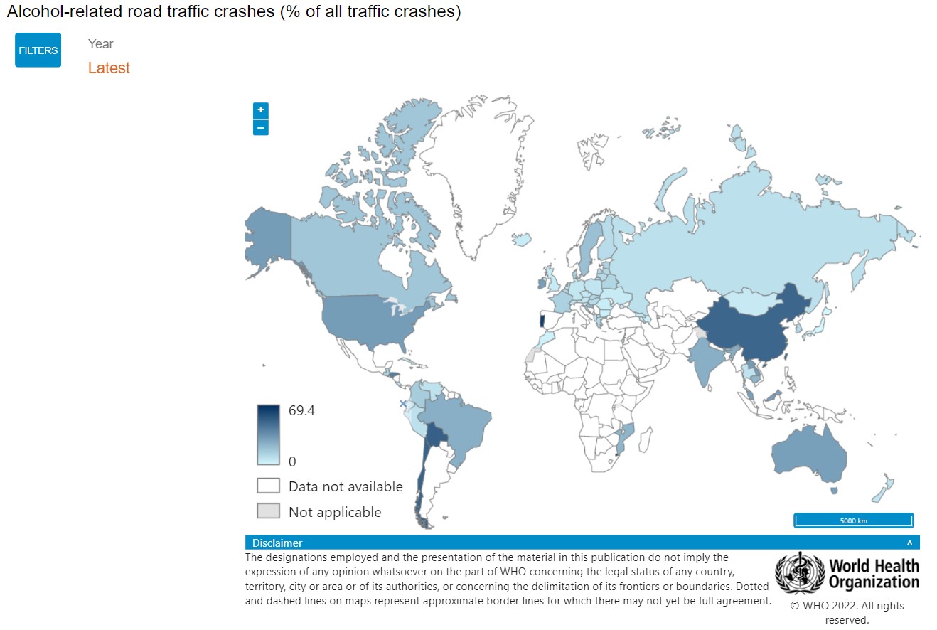 DSÖ’nün alkolle ilişkilendirilen trafik kazalarının dünya ortalamasını paylaştığı bir raporu bulunmuyor. Trafik kazası ve alkol tüketimi arasındaki ilişkiye dair bazı ülkelerin verileri var fakat burada da herhangi bir ortalama vermiyor.