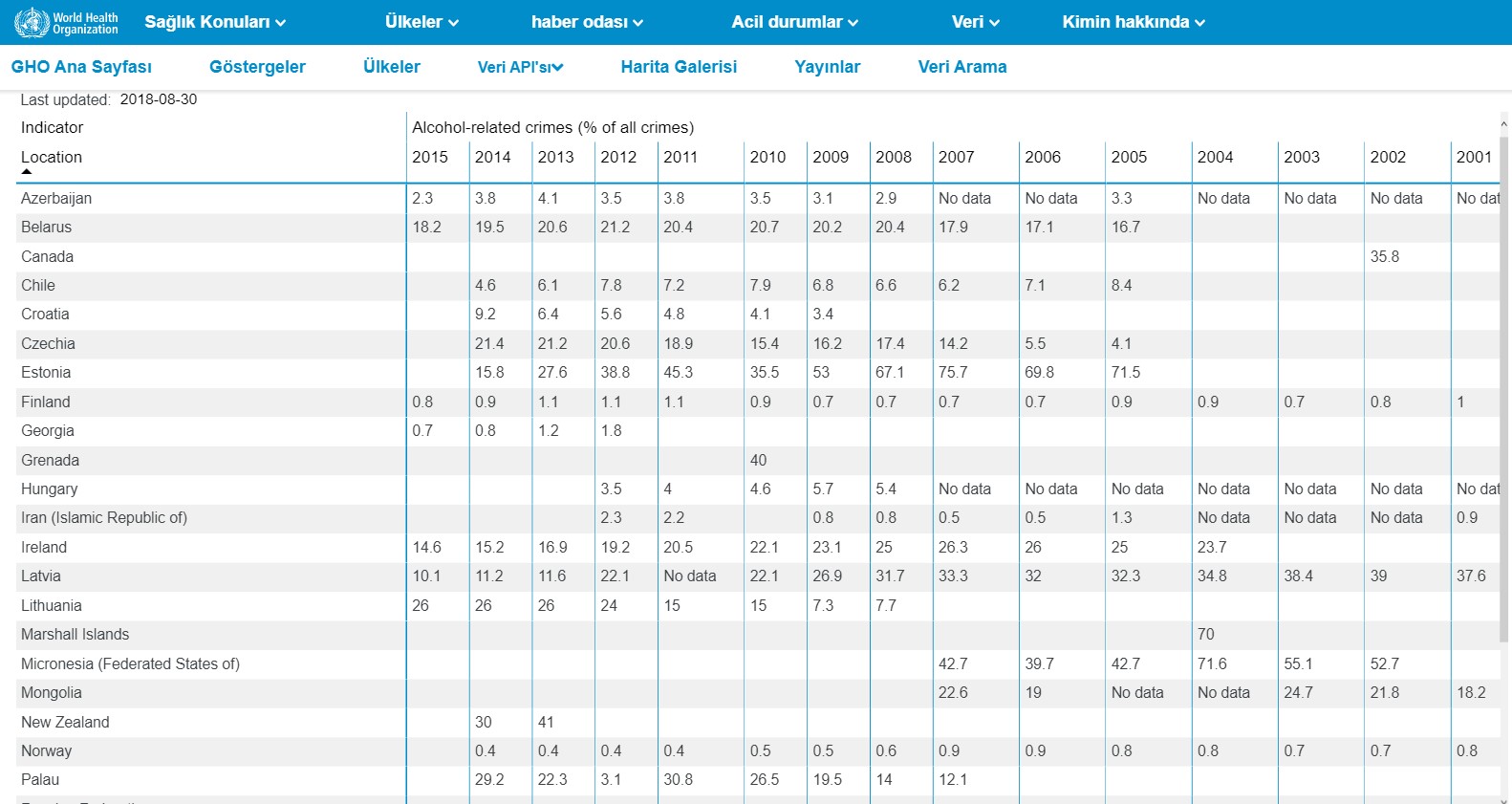 Alkolle ilgili suçlar için de ayrı bir bölüm olmasına rağmen iddiada verilen yüzdelere buradan ulaşamıyoruz. Buradaki veriler, ülkelerin paydaları verilerek paylaşılıyor ve farklı yıllarda sonuç alınamayan ülkelerin olduğu görülebiliyor. Türkiye dahil birçok ülkeden veri alınamamış.
