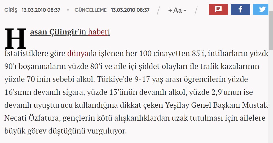 İddianın ulaşabildiğimiz en eski kaynağı, 2008 yılında yaptığı konuşmasıyla dönemin Yeşilay Başkanı Mustafa Necati Özfatura oldu. 1. Uluslararası Bağımlılık ve Önlenmesi Konferansı’nda konuşan Özfatura, Dünya Sağlık Örgütü’nü referans göstererek iddiadaki yüzdeler ile alkol tüketim ilişkisini dile getiriyor.