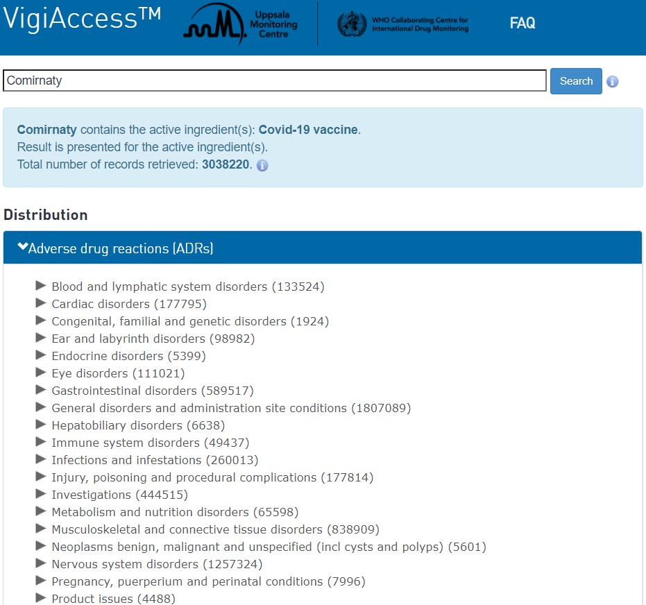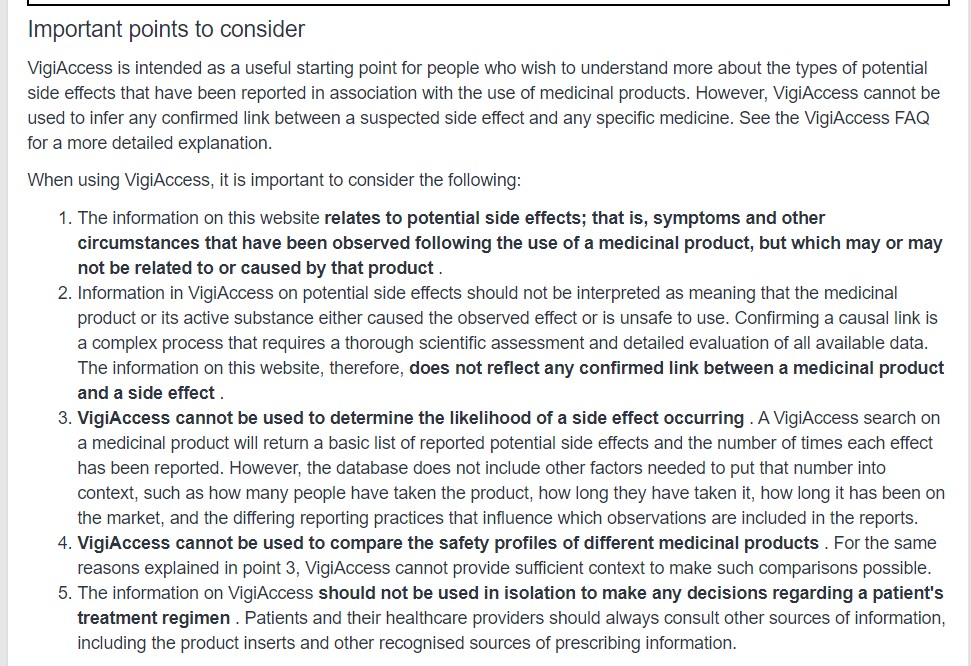 VigiAccess’te herhangi bir Covid-19 aşısının ismini arattığımızda tüm Covid-19 aşılarının tümüyle ilgili raporlanan vakaları görmek mümkün. Bunu arattığımızda da raporlanan 3 milyondan fazla vaka olduğu söyleniyor. VigiAccess bu aramaları göstermeden önce bazı uyarılarda bulunuyor. Bu uyarılarda ilk olarak buradaki vakaların ilaçların ve aşıların olası yan etkilerini gösterdiği belirtiliyor. Dahası bu sitedeki bilgiler yan etkiler ile ilaç arasındaki doğrulanmış bağlantıyı yansıtmamaktadır. Ayrıca, bu veri bankasının ilaçların yan etkilerini belirlemek için, ilaçların yan etkilerini birbiri ile karşılaştırmak için ve ilaçların uygulanışıyla alakalı konular için kullanılmaması konusunda uyarı yapılıyor.