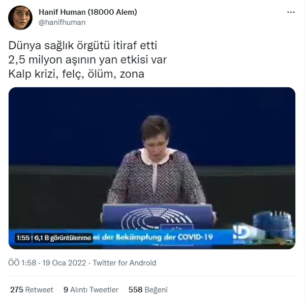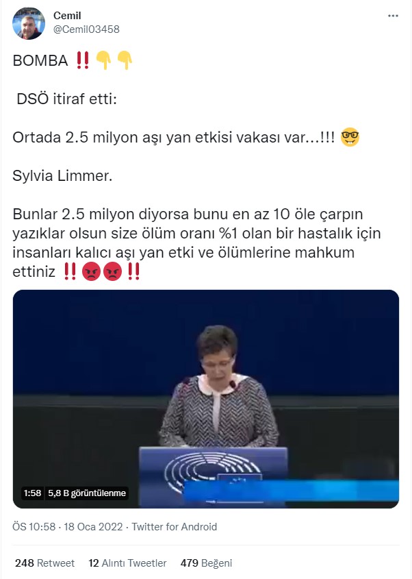 Son günlerde sosyal medyada yapılan paylaşımlarda Covid-19 aşısı ile ilgili ortaya bir iddia atıldı. Bu iddiaya göre Dünya Sağlık Örgütü Covid-19 aşısının 2,5 milyon yan etkisi olduğunu itiraf etti. İddia bir video ile paylaşıldı. Videoda bir kadının kürsüden Almanca konuşma yaptığı görülüyor. Paylaşımlarda kadının ismi Sylvia Limmer olarak geçiyor. İddia sosyal medyada hem Türkçe hem de diğer dillerde pek çok kez paylaşıldı.