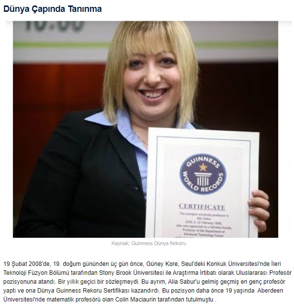 Günümüzü incelediğimizde ise 19 Şubat 2008’de Seul Konkuk Üniversitesi’nde İleri Teknoloji Füzyon bölümüne, 18 yaşındayken öğretim üyesi profesörü olarak atanan Alia Sabur‘un dünyanın en genç profesörü olma başarısına sahip olduğu anlaşılıyor. Alia Sabur’un Guinness Rekorunu elinde tuttuğunu söyleyebiliriz.