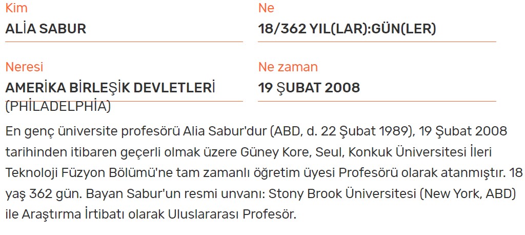 - Alia Sabur, 18 yaşında profesör olarak atanarak dünyanın en genç profesörü olmaya hak kazandı ve adını Guinness Dünya Rekorları kitabına yazdırdı.