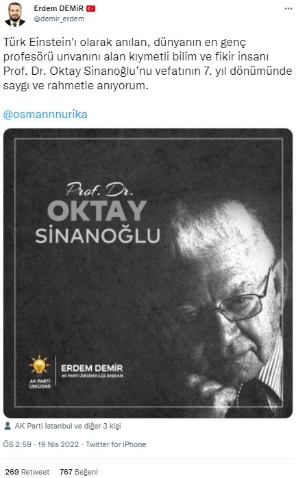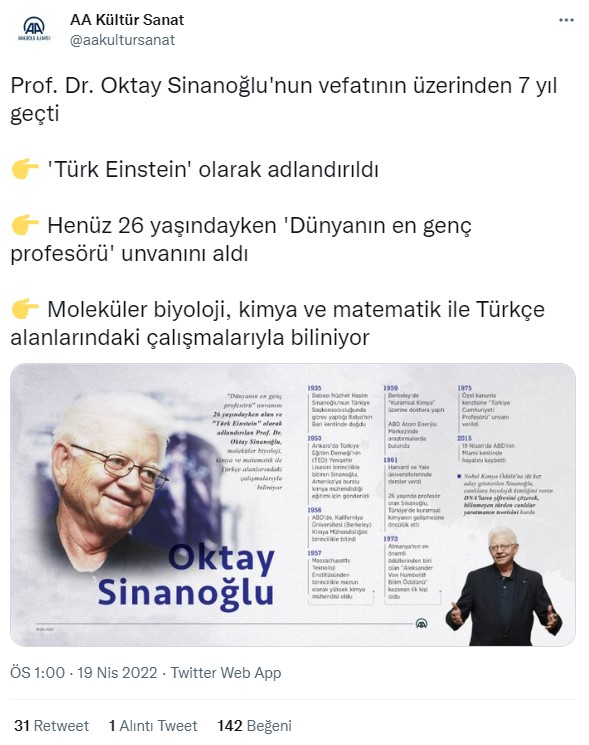 - Oktay Sinanoğlu’na 1975 yılında özel kanunla ilk ve tek Türkiye Cumhuriyeti Profesörü unvanı verilmişti.