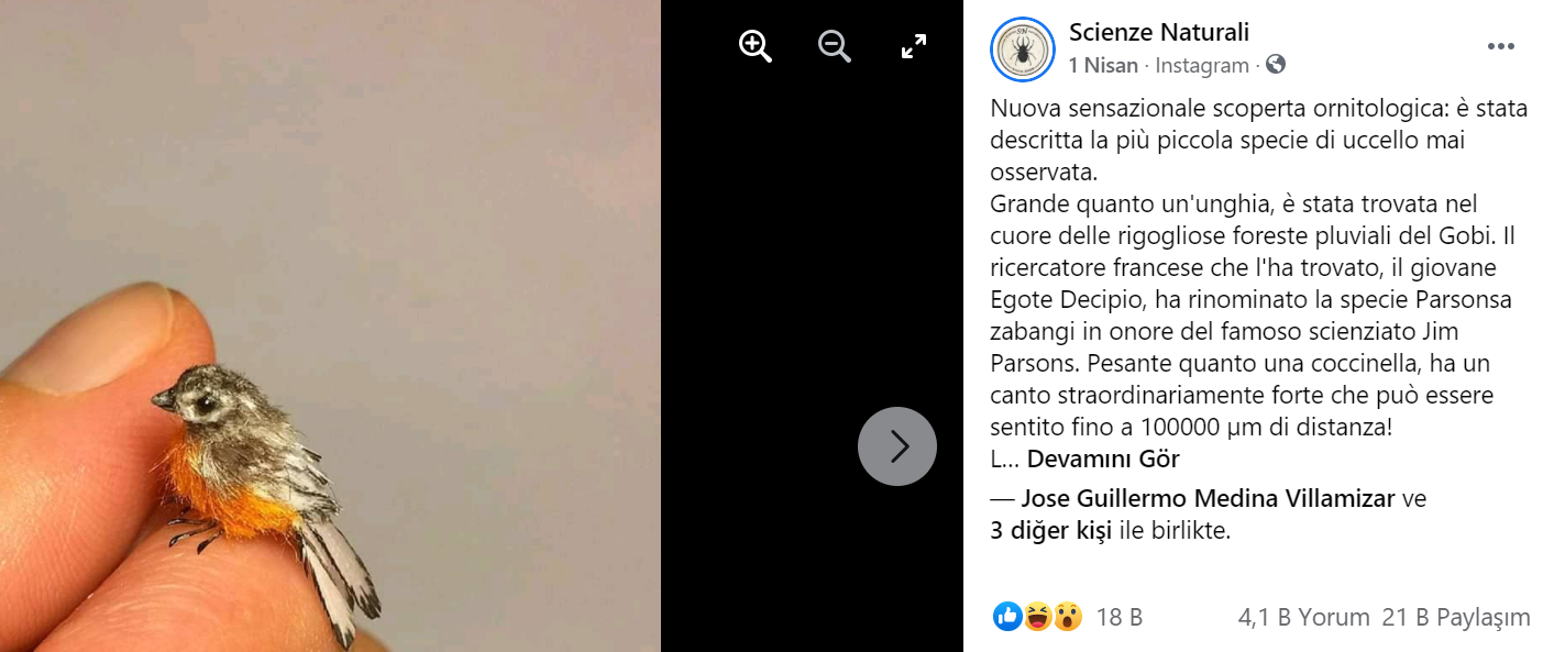 En küçük kuş türünün arı sinekkuşu olduğu ve Küba’da bulunduğu doğru olsa da, görsel doğru değil. Bir Google’da görsel arama yaparak söz konusu resmin izini sürdük. Fotoğrafın, Roma Sapienza Üniversitesi’ndeki Doğa Bilimleri departmanı tarafından 1 Nisan’da yayımlandığını ve daha sonra bir 1 Nisan şakası olarak paylaşılan bir Facebook gönderisi olduğunu tespit ettik.