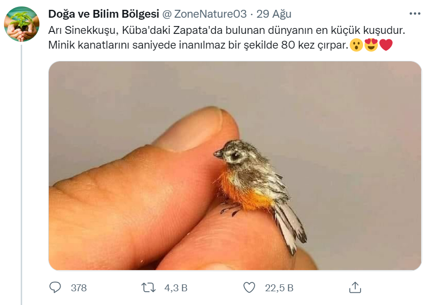 Hatta bir sosyal medya kullanıcısı 29 Ağustos’taki paylaşımında: “Arı sinekkuşu, Küba’daki Zapata’da bulunan dünyanın en küçük kuşudur. Minik kanatlarını saniyede inanılmaz bir şekilde 80 kez çırpıyor,” diye yazdı ve tweet 22.000’den fazla ‘beğeni’ aldı.