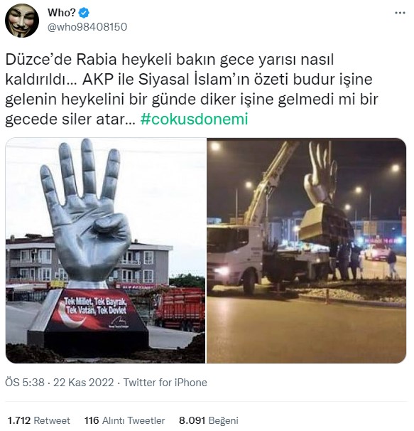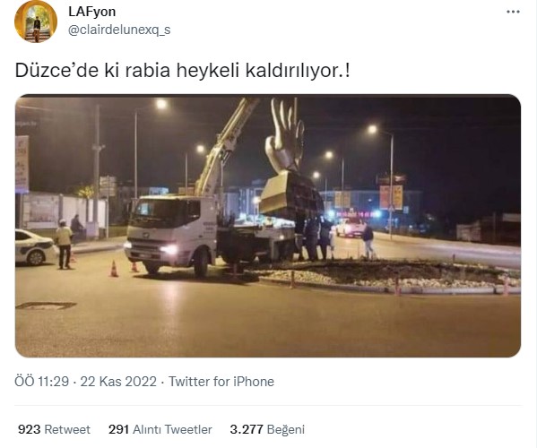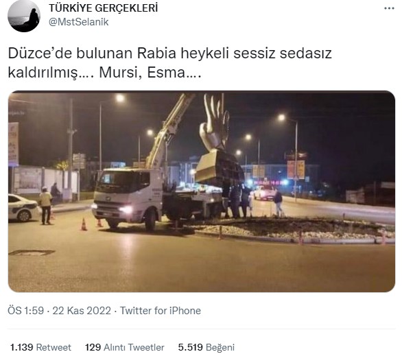 Sosyal medyada paylaşılan bir gönderide, Düzce’de Kuyumcuzade Bulvarı üzerindeki kavşakta bulunan Rabia heykelinin kaldırılma görüntüleri, “Düzce’de ki rabia heykeli sessiz sedasız kaldırılmış” notuyla paylaşıldı.