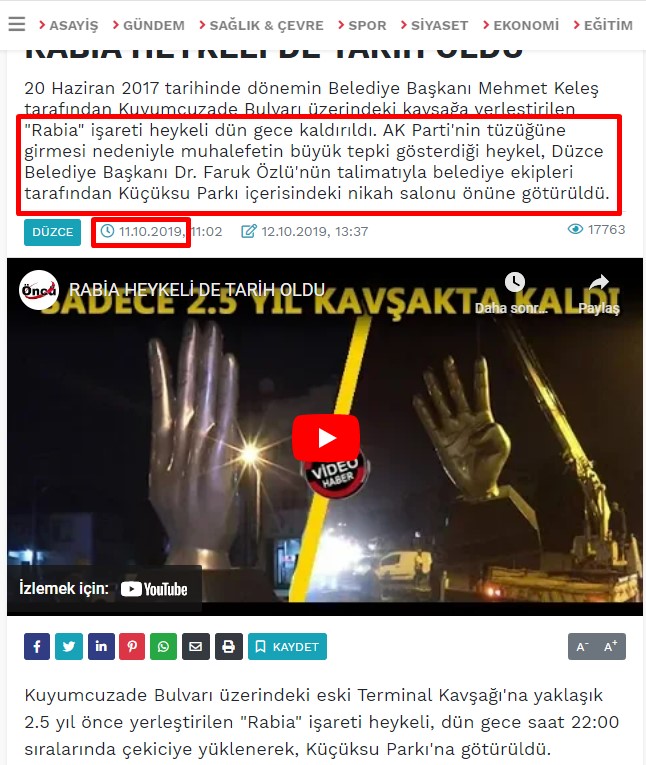 Google’da tersine görsel arama yaptığımızda da aynı şekilde 11 Ekim 2019 yılındaki haberlerden, olayın güncel olmadığını anlıyoruz. Rabia heykelinin 2019 yılında Kuyumcuzade Bulvarı üzerinden kaldırılarak, Küçüksu Parkı içerisindeki nikâh salonu önüne götürüldüğü bilgisine yer verilmiş. Bunun yanında heykelin halkın tepkisinden kaynaklı olarak, Düzce Belediye Başkanı Dr. Faruk Özlü’nün talimatıyla belediye ekiplerince kaldırıldığı belirtiliyor. 2017 yılında da Düzce Ülkü Ocakları üyelerinin, kavşağa dikilen Rabia heykeline tepki gösterdiği ve protesto yürüyüşü gerçekleştirdiği anlaşılıyor.