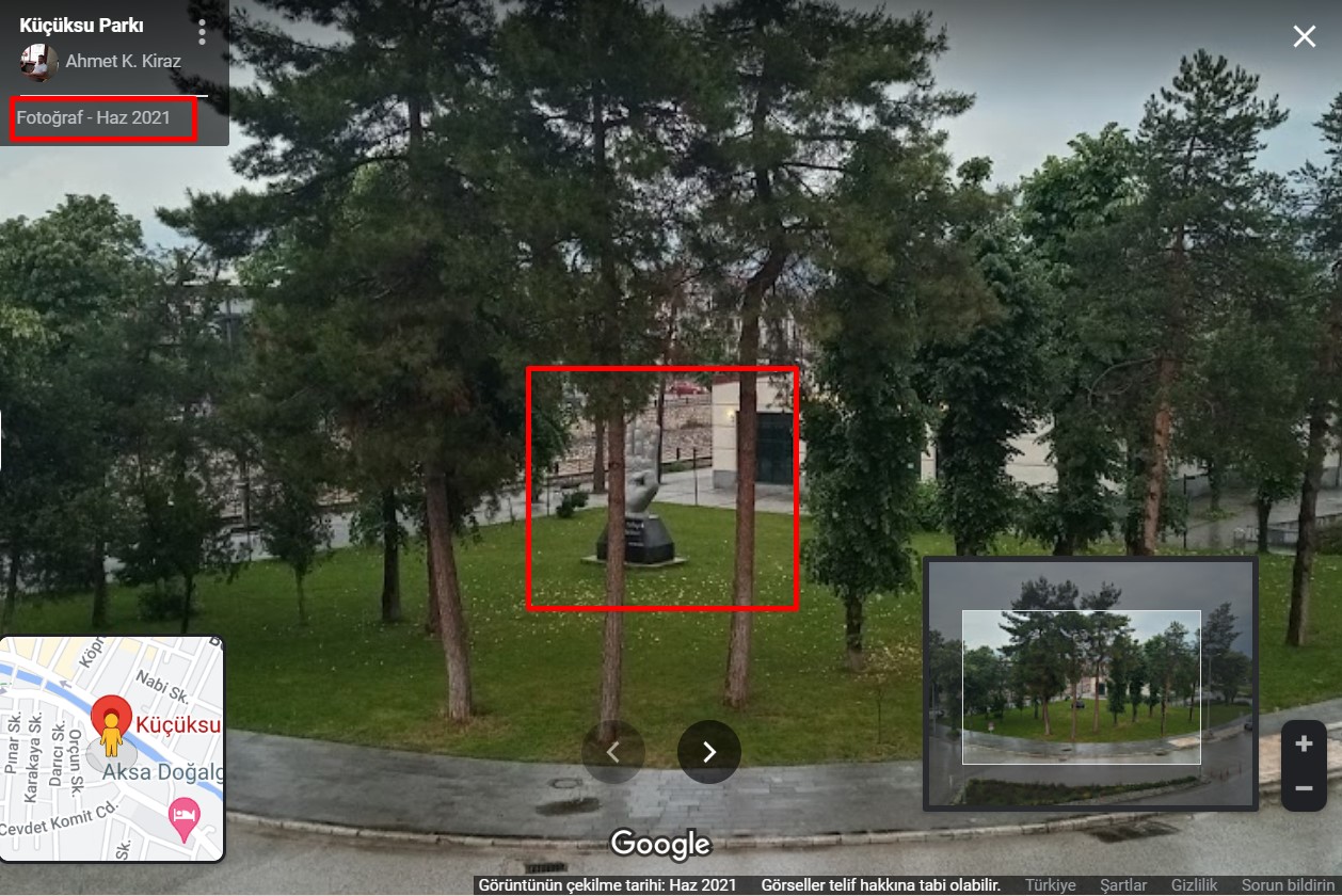 Heykelin Düzce Küçüksu Parkı nikâh salonunun önüne taşındığı bilgisini doğrulamak adına Google Maps üzerinden konum araştırması yaptığımızda, 2021 Haziran ayında bir kullanıcı tarafından paylaşılan fotoğrafla karşılaşıyoruz. Rabia heykelinin Küçüksu Parkı içerisinde yer aldığını böylece doğrulamış oluyoruz.