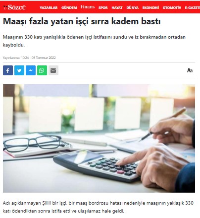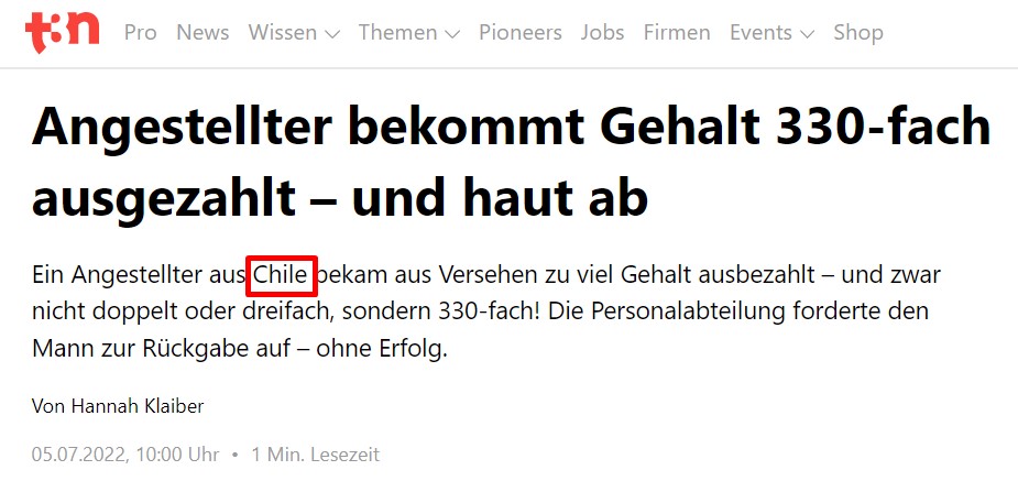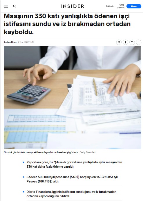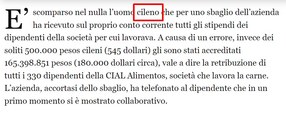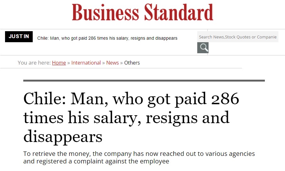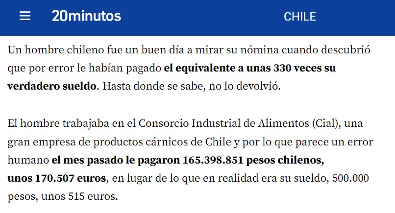 Şili’nin ekonomi gazetelerinden Diario Financiero’nun haberine göre ülkenin en önemli şirketlerinden biri olan CIAL Alimentos’un çalışanlarından birisine maaşının (500.000 Şili pesosu) 330 katı değerinde para yatırılmış.