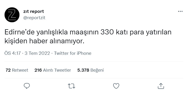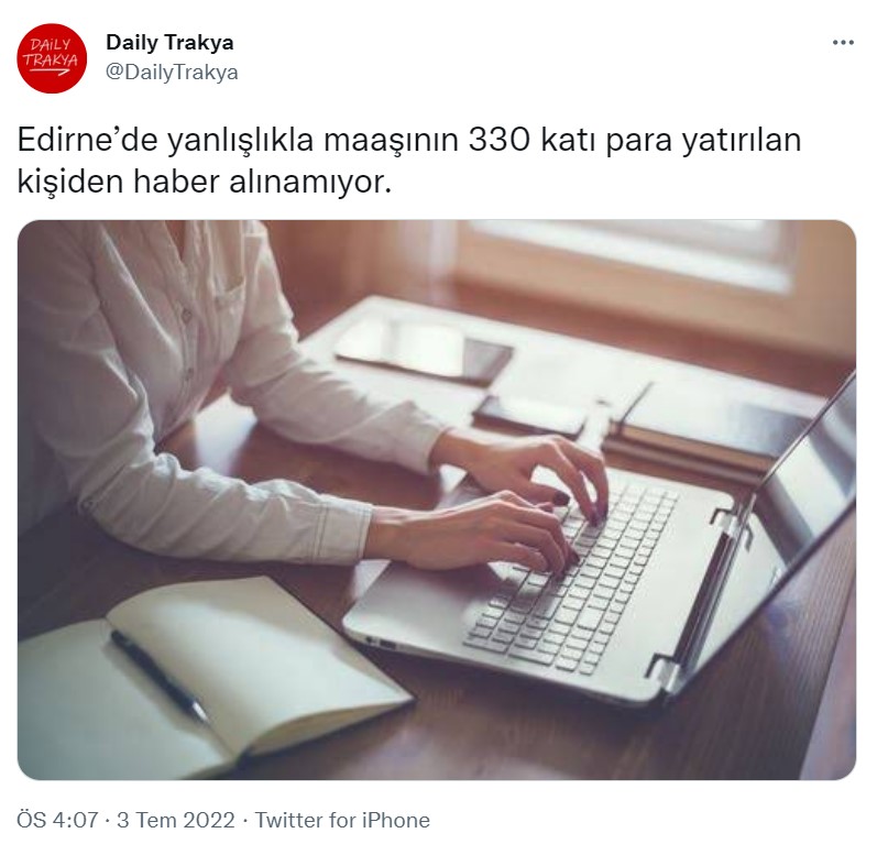 Twitter’da yayılan iddiaya göre Edirne’de, hesabına maaşının 330 katı değerinde para yatan işçiden haber alınamıyor.