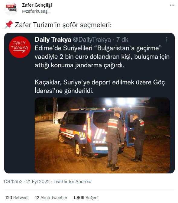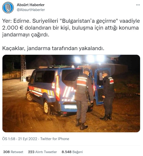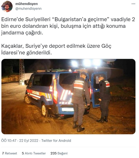 Geçtiğimiz gün birçok Twitter hesabı tarafından paylaşılan bir gönderide, Suriyeli göçmenleri Bulgaristan’a geçirme vaadiyle 2 bin Euro dolandıran bir kişinin, daha sonra buluşma konumuna jandarmayı çağırdığı ve göçmenlerin Suriye’ye deport edilmek üzere Göç İdaresi’ne gönderildiği iddia edildi.