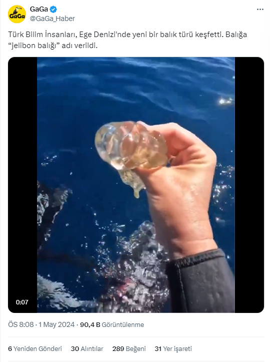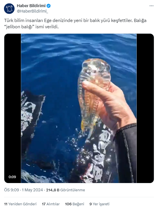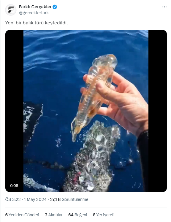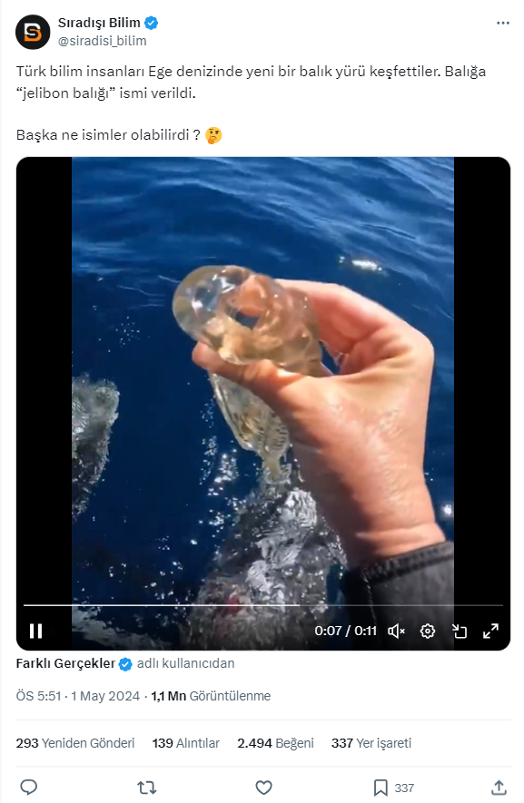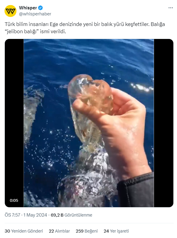 1 Mayıs 2024’te sosyal medya platformu X’te paylaşılan bir video ile sözde Türk bilim insanlarının Ege’de ‘jelibon balığı’ isimli transparan görünüme sahip bir balık keşfettikleri iddia edildi.