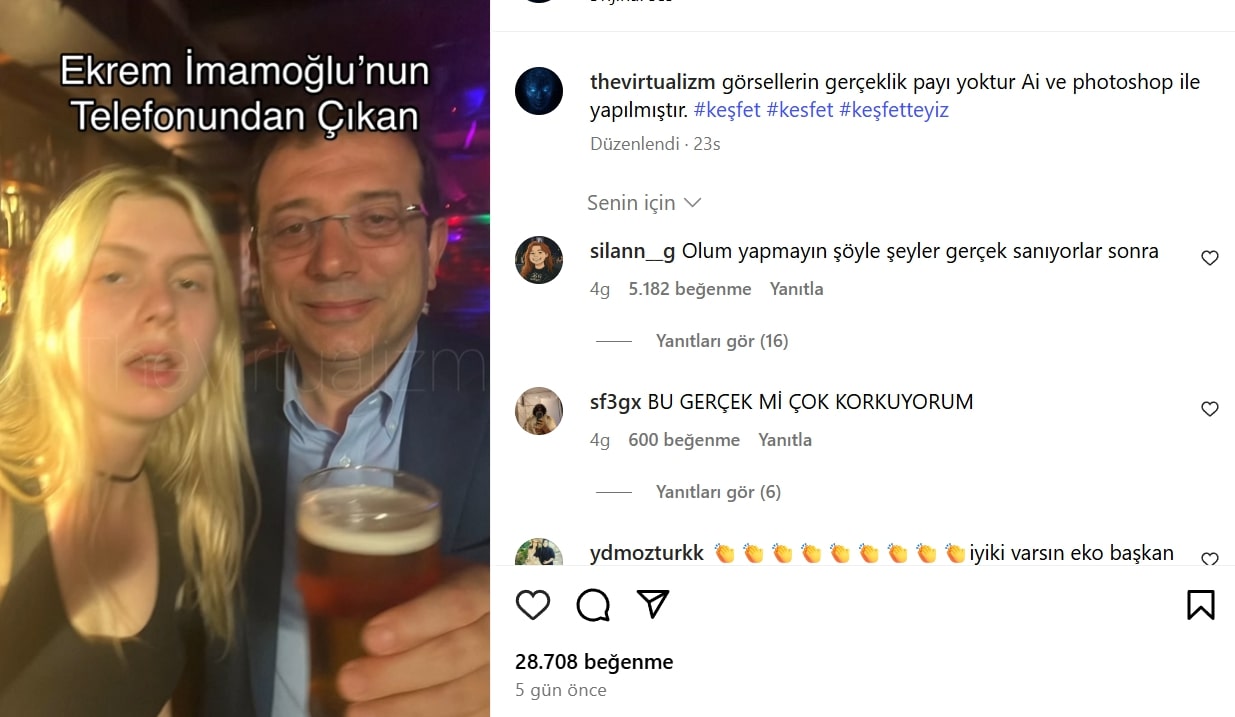 Hesapta, “Ekrem İmamoğlu’nun Telefonundan Çıkan Görüntüler”, “Ünlüler Paralel Evrende”, “Kıvanç Tatlıtuğ Yurt Dışında Doğsaydı”, “Espri Yapan Erkeklerden Hoşlanıldığını Duyduğumda Kafamda Oluşan Sahne”, “Acun Ilıcalı ve Ali Koç Fenerbahçe’yi Şampiyon Yapacak Kadroyu Kurmaya Çalışıyor” başlıklı içeriklerinde de yapay zeka ile oluşturduğu benzer görseller yer alıyor.