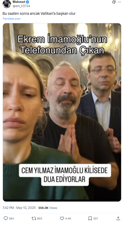 Sosyal medyada İBB Başkanlığından uzaklaştırılan Ekrem İmamoğlu, komedyen Cem Yılmaz ve oyuncu Serenay Sarıkaya’nın birlikte kilisede dua ederken çektikleri bir fotoğraf paylaşılıyor.