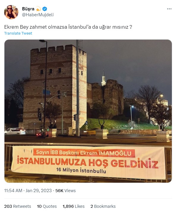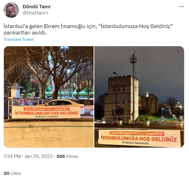 Geçtiğimiz gün sosyal medyada 4 Mayıs günü İstanbul’a gelecek Ekrem İmamoğlu için ‘İstanbulumuza hoş geldiniz’ pankartı asıldığı iddia edildi. Pankarta ’16 milyon İstanbullu’ notu da düşülmüştü.