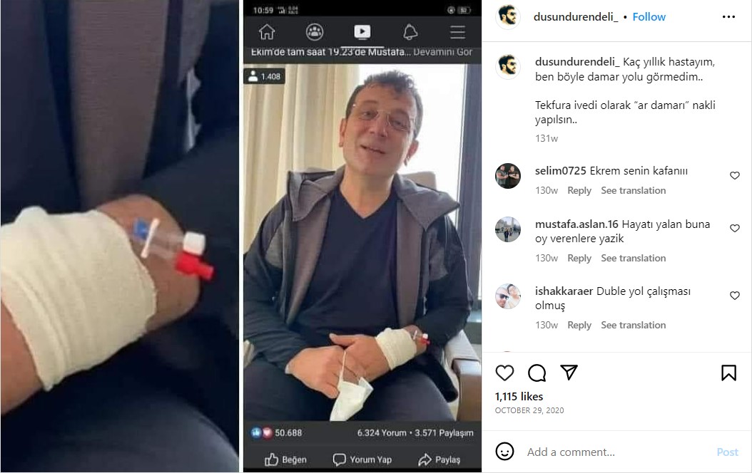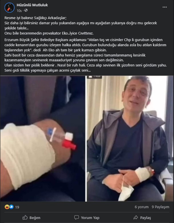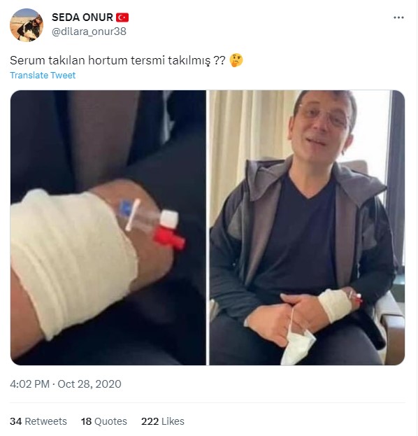 Yaşanan olaylar üzerine sosyal medyada pek çok paylaşım yapıldı. Bu paylaşımlardan birinde Ekrem İmamoğlu’nun eline damar yolu açılmış, serum takılı bir fotoğrafı da vardı. Sosyal medya kullanıcıları fotoğrafın Erzurum olayından sonra kaydedildiğini ima ederek damar yolunun yanlış açıldığını iddia etti.