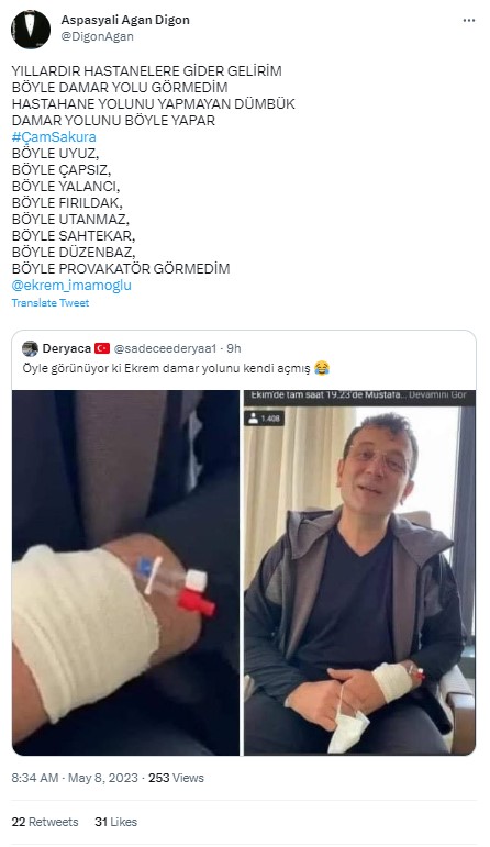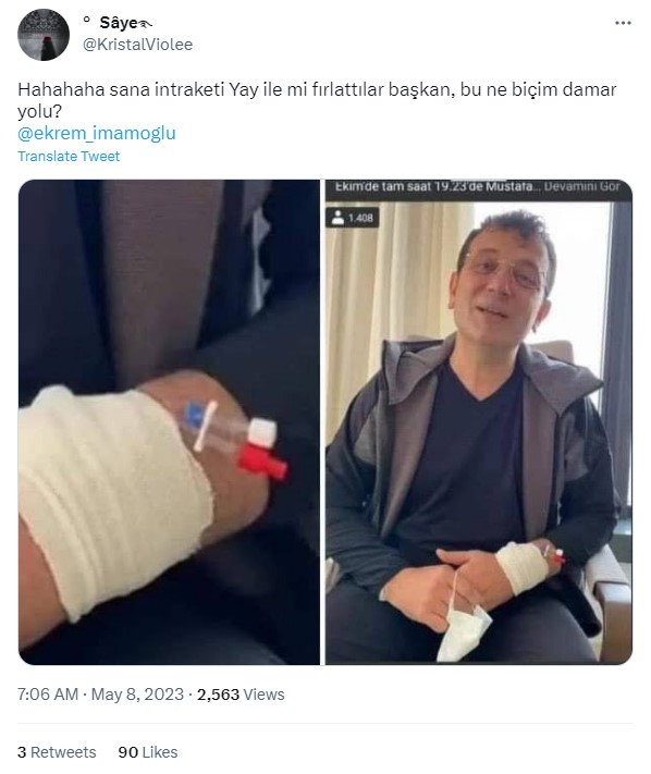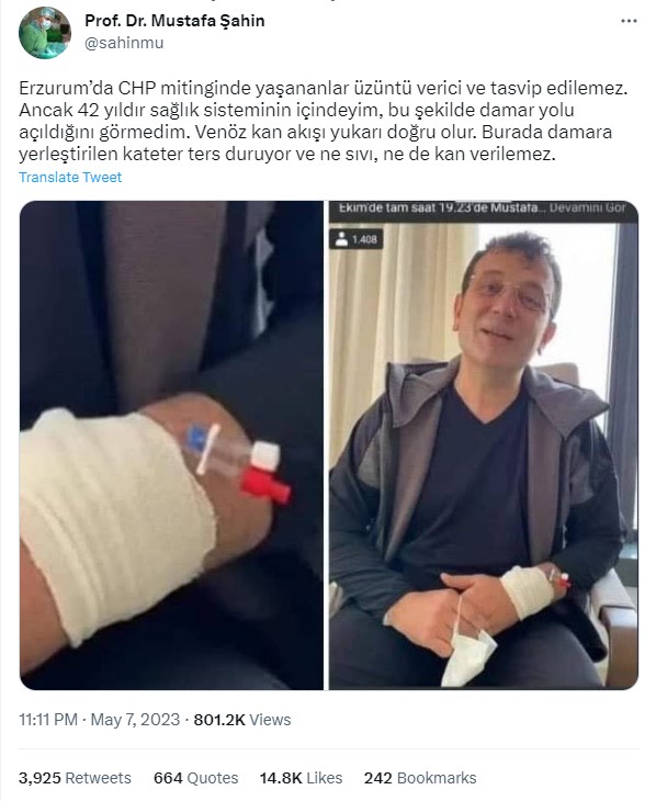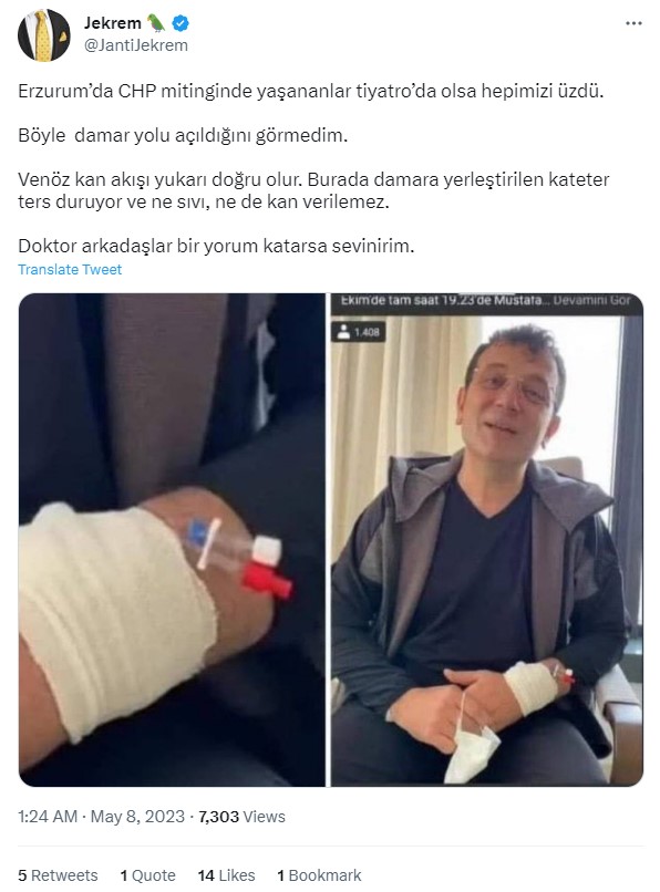 - Ekrem İmamoğlu’nun koluna damar yolu açılmış görüntüleri 7 Mayıs 2023’te yaşanan Erzurum mitingi saldırısından sonra kaydedilmemiş.