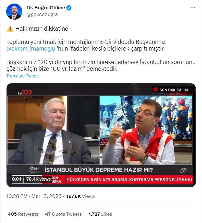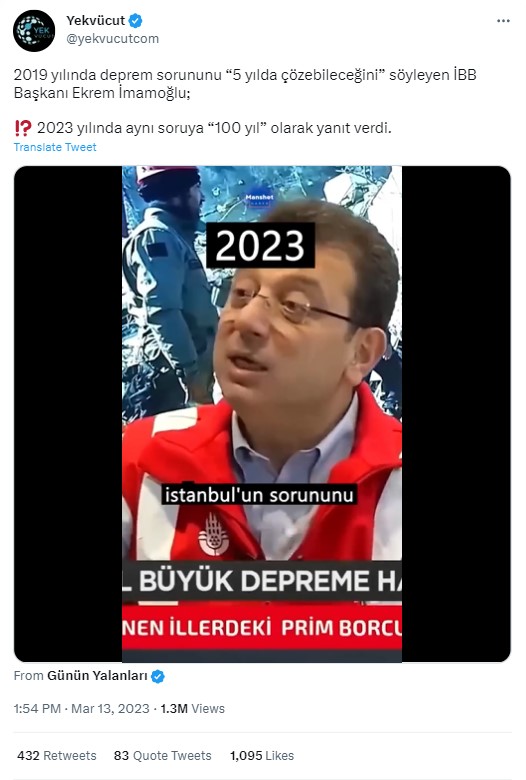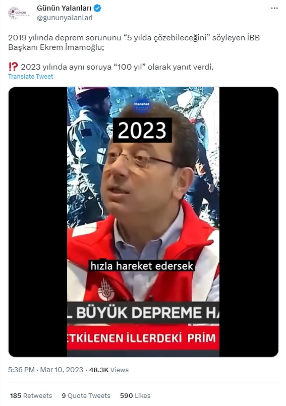 Dolayısıyla iddialara konu olan video kesilerek montajlanmış; Ekrem İmamoğlu’nun Uğur Dündar’a verdiği cevap bağlamından koparılarak çarpıtılmış. Yani İmamoğlu, İstanbul’un depreme hazırlıklı hale gelmesi için 100 yıl gerektiğini söylemiyor. 1999’dan bu yana yapılan hızda hareket edilirse hazırlığın 100 yıl süreceğini söyleyerek geçmişe yönelik bir eleştiri yapıyor.