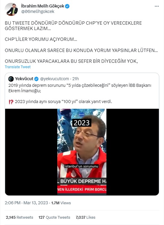 İmamoğlu’nun bu soruya verdiği cevap ise, geçtiğimiz günlerde sosyal medyada gündeme girdi. İstanbul Büyükşehir Belediye Başkanı’nın bu soruya 2019’da farklı, günümüzde farklı cevap verdiği iddia edildi. İddialara göre İmamoğlu, 2019’da İstanbul’daki deprem sorununun 5 senede çözülebileceğini söylerken 2023’te bu sürenin 100 yıl olduğunu ifade etti.