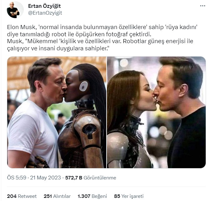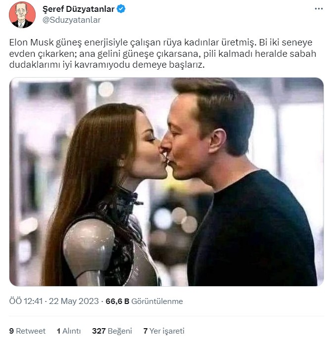 Sosyal medyada dolaşımda olan bir fotoğrafta, Elon Musk’ın robotla öpüşürken fotoğraf çektirdiği