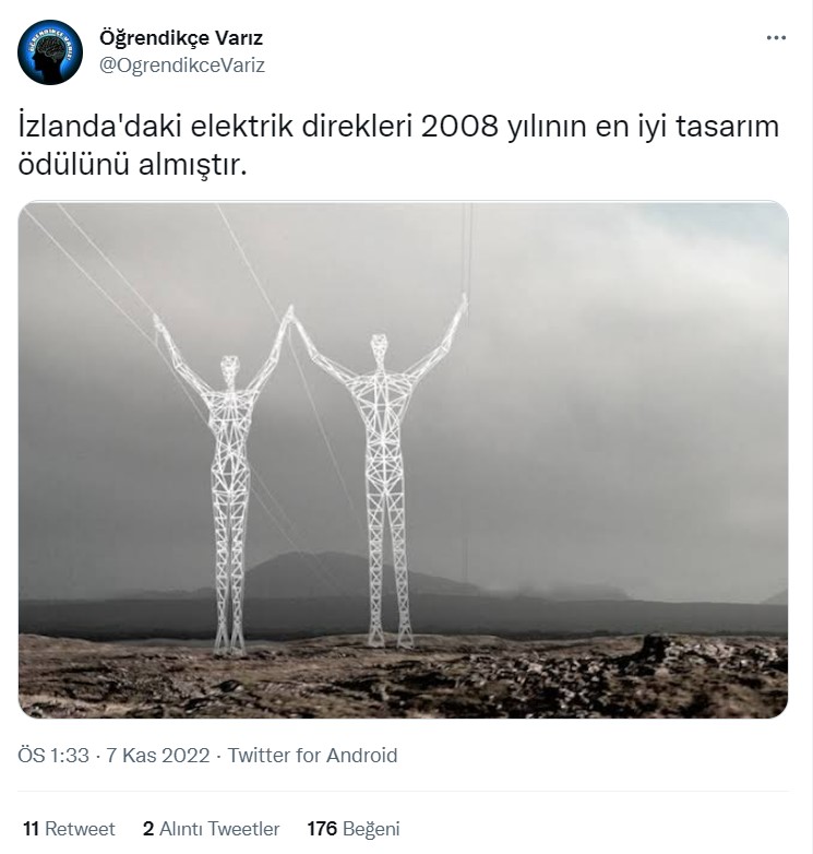 İzlanda’da yer alan ve 2008 yılının en iyi tasarım ödülünü aldığı iddia edilen fotoğraf için Google araması yapıldığında anlamlı bir sonuca ulaşılamıyor. Araştırmamıza tersine görsel arama tekniğini kullanarak devam ettiğimizde, bu fotoğrafta görülen elektrik direklerinin ABD merkezli Choi+Shine isimli firma tarafından tasarlandığı ve birçok elektrik direği tasarım yarışmasında ödül kazandığı görülüyor.