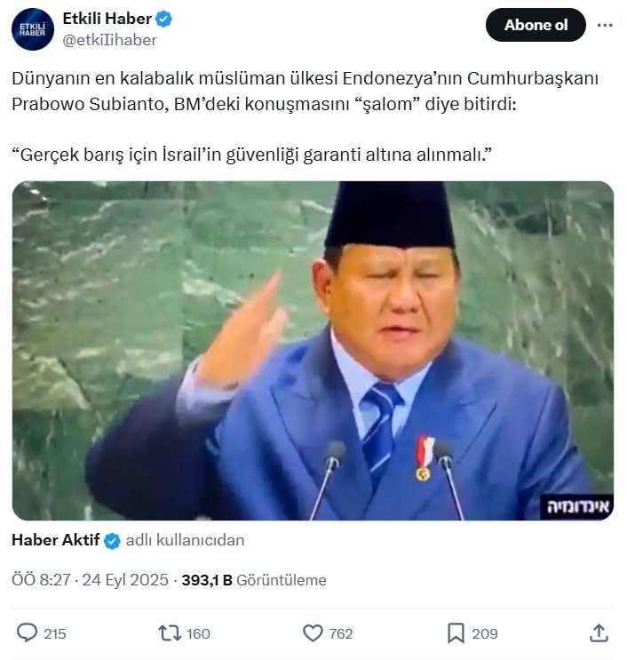 “Cumhurbaşkanı Prabowo Subianto BM’deki konuşmasını ‘Şalom’ diye bitirdi ve ‘Gerçek barış için İsrail’in güvenliği garanti altına alınmalı’ dedi.”