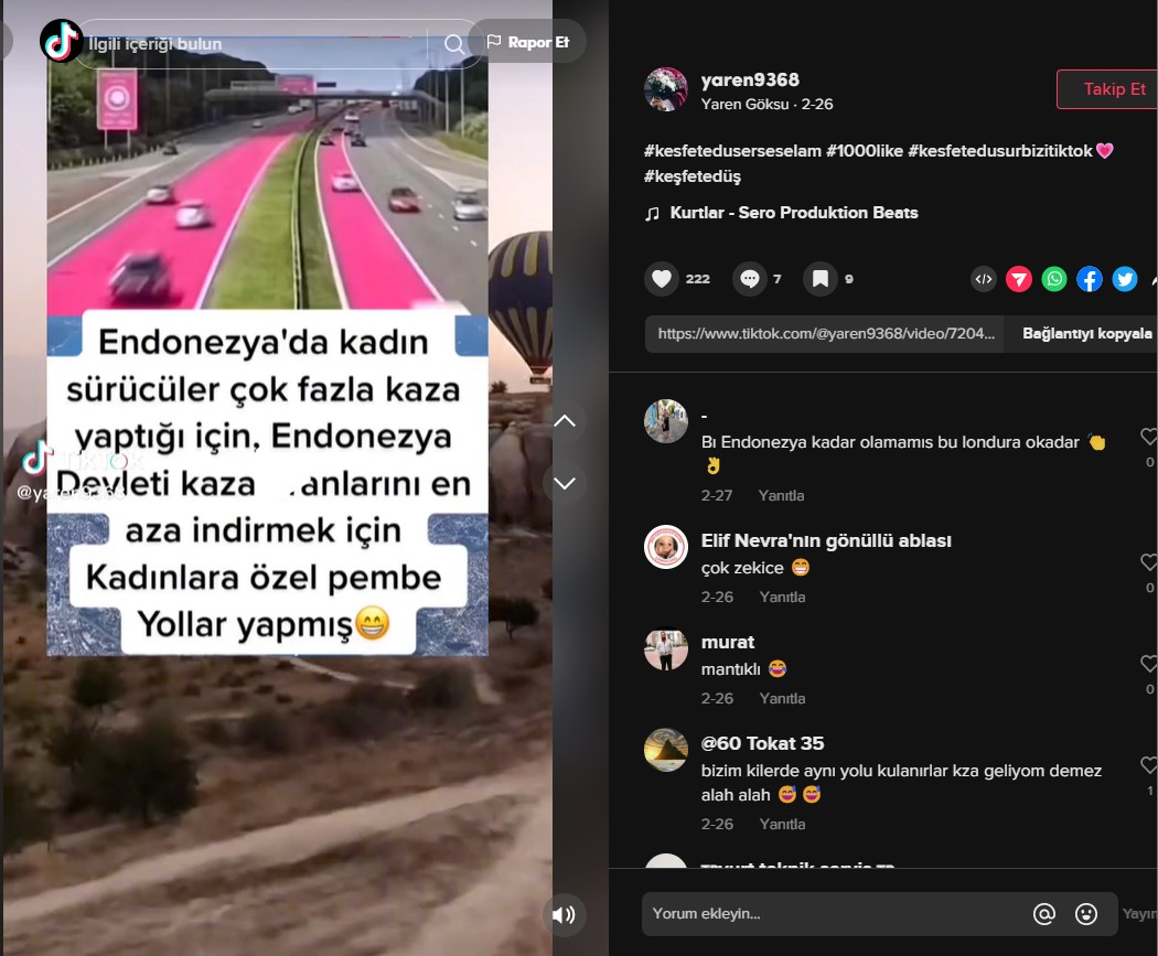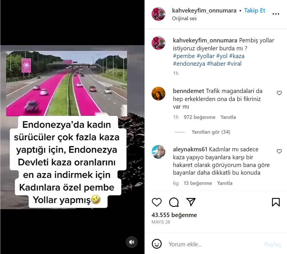 Sosyal medyada, pembe yollar döşenmiş bir otoyol görüntüsünün üzerine “Endonezya’da kadın sürücüler çok fazla kaza yaptığı için Endonezya devleti kaza oranını en aza indirmek için kadınlara özel pembe yollar yapmış.” yazılmış. 40 binden fazla beğeni alan gönderinin doğruluğunu inceledik.