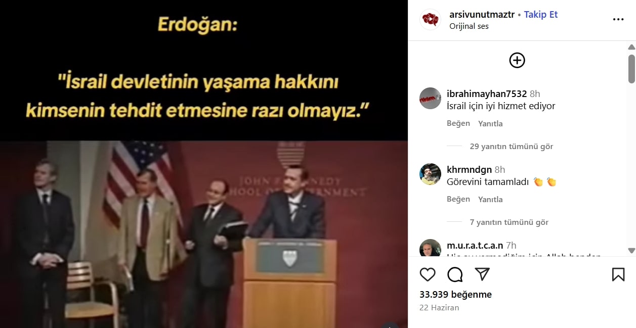 Yani iddiada kullanılan kesitte Erdoğan’ın tek taraflı bir şekilde İsrail’i savunduğu anlaşılabilir. Ancak dönemin başbakanı olarak, bölgesel güvenlik için İsrail ve Filistin devletlerinin her ikisi için de güvenlik hassasiyetinin korunması ve değer verilmesi üzerinde durmuş.