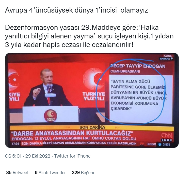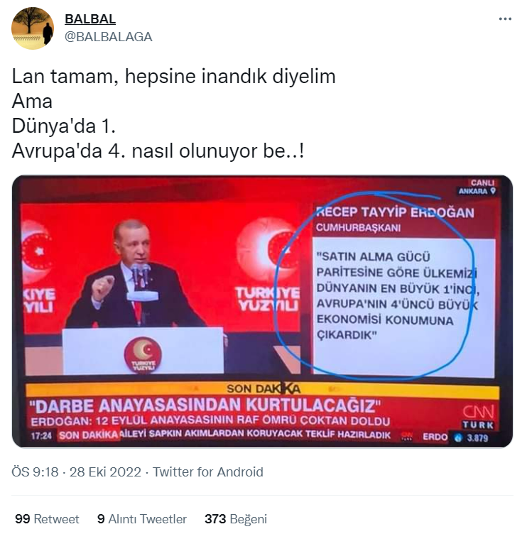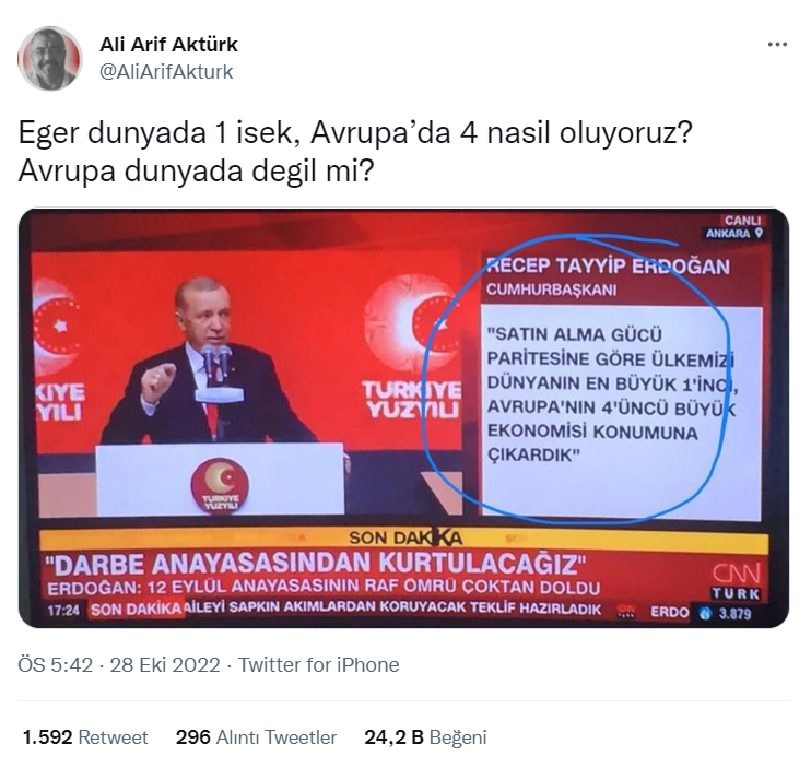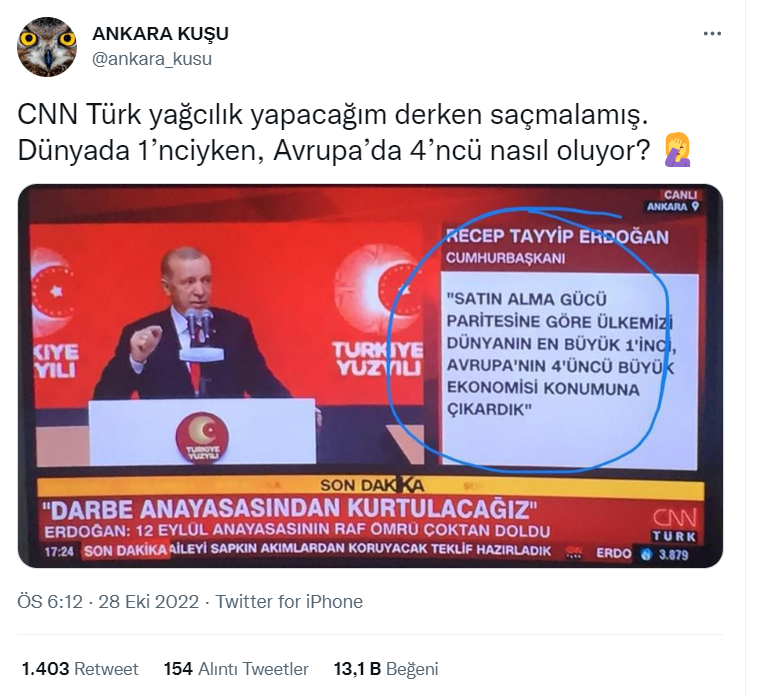 AK Parti genel başkanı ve Cumhurbaşkanı Recep Tayyip Erdoğan 28 Ekim günü Ankara Spor Salonu’nda gerçekleştirdiği Türkiye Yüzyılı tanıtım toplantısında bir konuşma gerçekleştirdi. Konuşmasının bir bölümünde Türkiye’nin satın alma gücü paritesine göre ekonomik büyüklüğünden bahsetti. Ancak konuşmasının bu kısmı CNN Türk ekranına hatalı yansıdı.