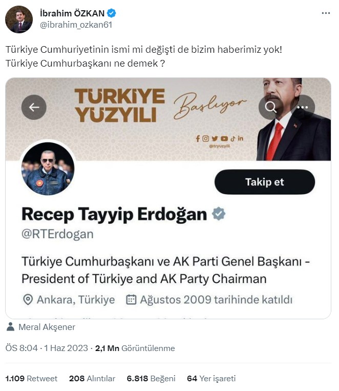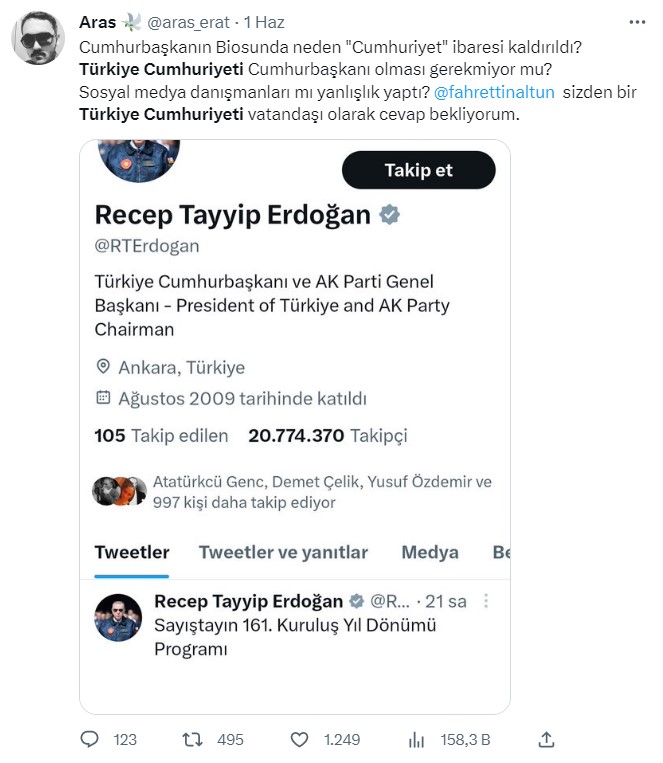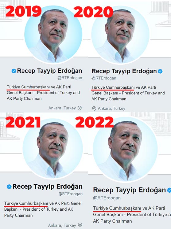 - Erdoğan’ın Twitter hesabında yer alan ‘Türkiye Cumhuriyeti’ ibaresi 2023’te değiştirilmedi.