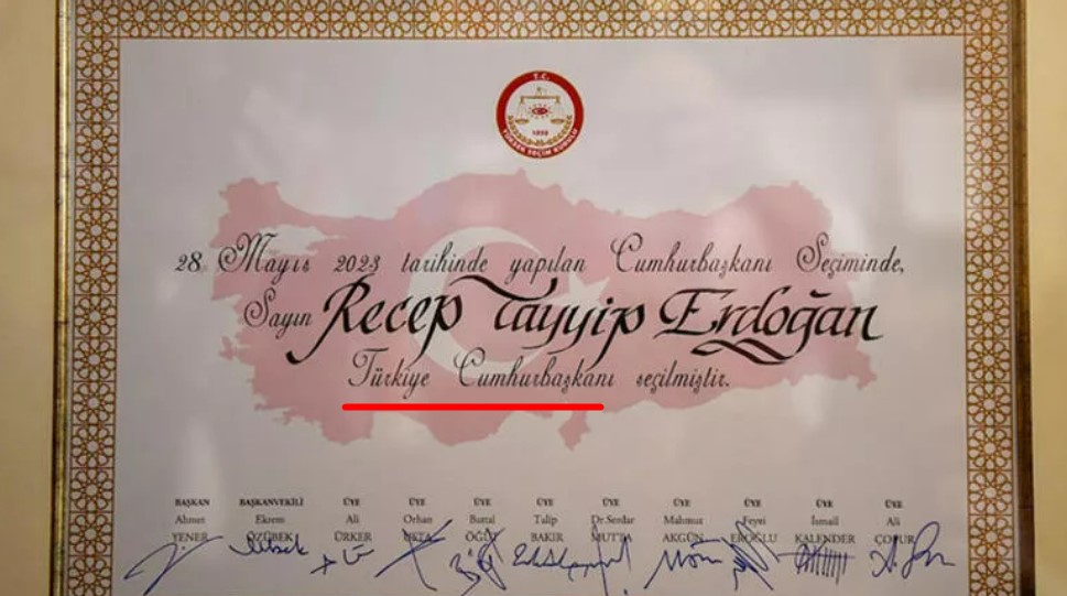 Öte yandan Erdoğan’ın mevcut seçim ve önceki seçim sonuçlarından sonra teslim edilen Cumhurbaşkanlığı mazbatasında da resmi ibareyle “Türkiye Cumhurbaşkanı” yazdığını doğrulamak mümkün.