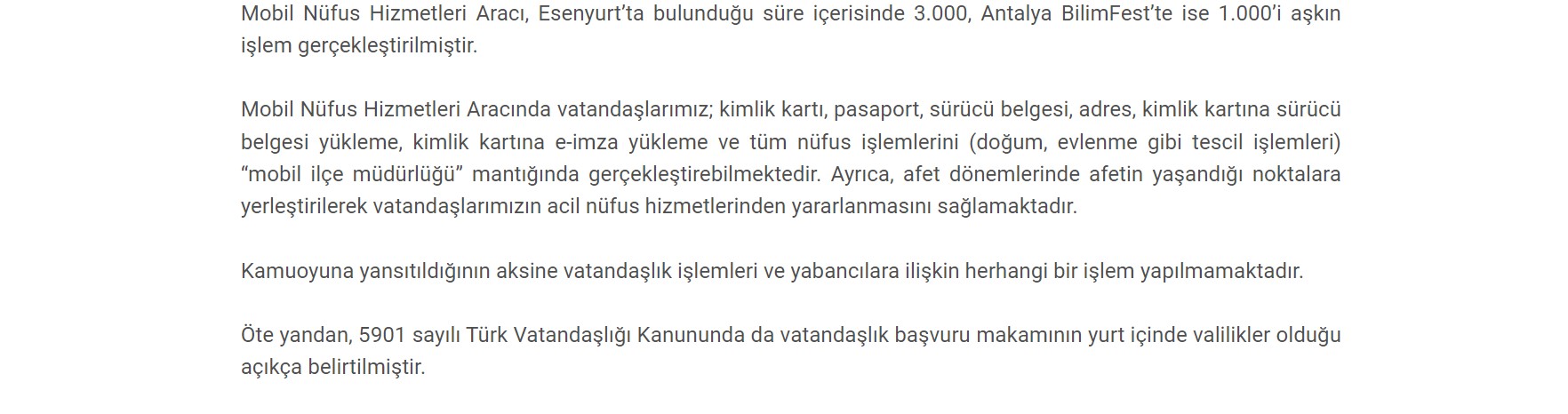 Videonun açıklama kısmında Mobil Nüfus Hizmetleri Aracının; afet, acil durum ve ihtiyaç duyulan alanlarda, Mobil Nüfus Müdürlüğü olarak hizmet vereceği belirtilmiş. Hiçbir şekilde sığınmacılar veya yabancılar anılmamış.