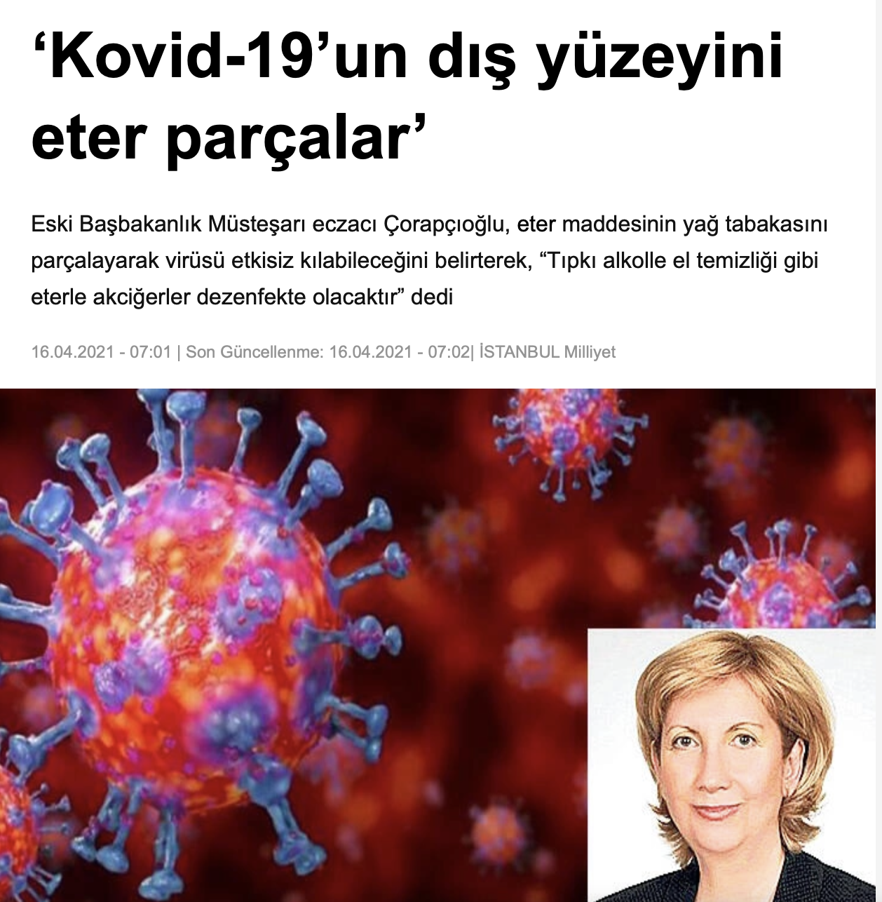 Milliyet Gazetesi haberinde, eterin vücuttaki koronovirüsü yok edeceğine yönelik iddiaya yer verildi. Haberde görüşlerine başvurulan Türkiye Başbakanlık Eski Müsteşarı Eczacı Füsun Köroğlu Çorapçıoğlu, eter maddesinin koronavirüsün yağ tabakasını parçalayarak etkisiz kılabileceğini iddia ediyor. Öte yandan Çorapçıoğlu, “Soluma yoluyla yeni enfekte olmuş bir hastaya, maksimum 3 damla eter koklattığımızda virüsün yağ tabakası parçalanarak etkisiz hale gelecektir. Tıpkı alkolle el temizliği gibi eterle akciğerler dezenfekte olacaktır” ifadelerini kullanıyor.