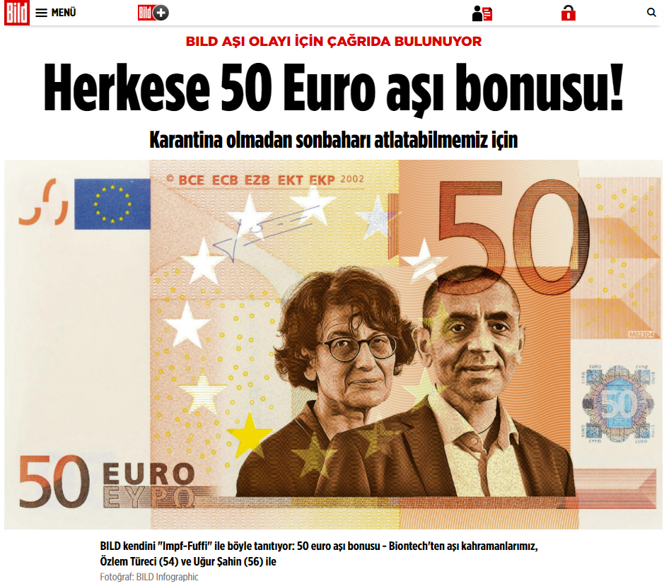 Bild, Almanya’da artan vaka sayılarına istinaden aşılanmayı teşvik etmek amacıyla tam aşılanan vatandaşlara 50 euro ödül verilmesi çağrısında bulunmuştu. Bunu yaparken de üzerinde Özlem Türeci ve Uğur Şahin’in fotoğraflarının yer aldığı 50 euro’luk bir banknotunu dijital olarak tasarladı. Yani sonuç olarak Avrupa Merkez Bankası’nın kabul ettiği böyle bir banknot tasarımı gerçekte mevcut değil.