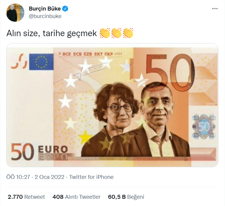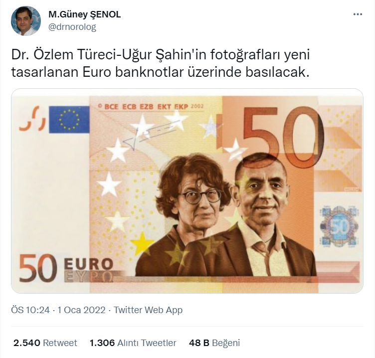 Sosyal medyada BioNTech’in kurucuları Özlem Türeci ve Uğur Şahin’in fotoğraflarının yeni tasarlanan euro banknotlarının üzerinde basılacağına dair bir iddia paylaşıldı. Twitter’da on binlerce beğeni olan bu iddia tweetlerinde bir de Türeci ve Şahin’in fotoğraflarının yer aldığı 50 euro görseli yer alıyordu.