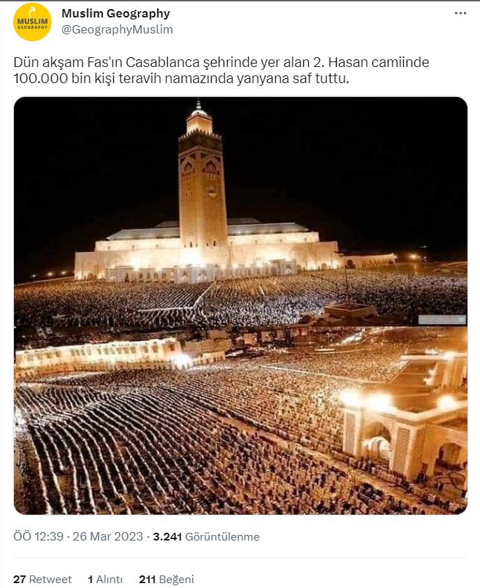 Sosyal medyada farklı ülkelerden Ramazan manzaraları paylaşılmaya devam ediyor. Fas’taki II. Hasan Camii’nde kalabalık bir şekilde kılınan namazı gösteren fotoğraflar, güncel teravih namazını gösteriyormuş gibi anlaşılmış. Bu fotoğrafları inceledik.