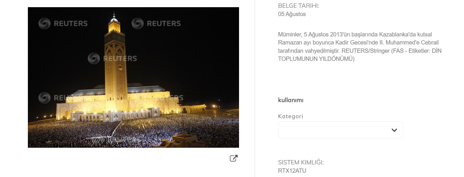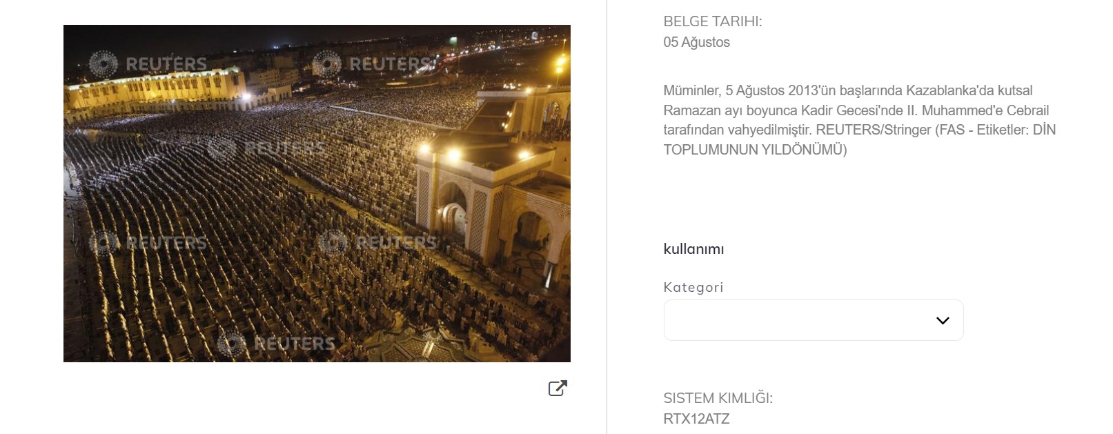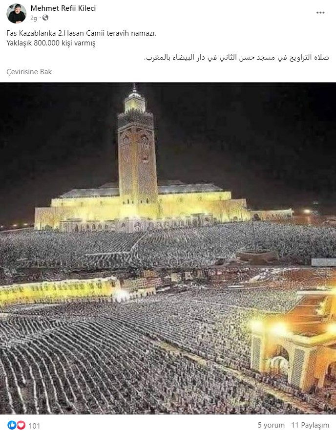 Fotoğrafları tersine görsel arama metoduyla tarattık. Fotoğraflar Reuters’ın fotoğraf arşivinde yer alıyor. Her ikisi de 5 Ağustos 2013’te Kazablanka’daki Kadir Gecesi’nde çekilmiş.